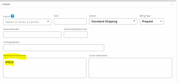 - In Warehouse Instructions, add the note: “HOLD” (optionally include the release date or reason).